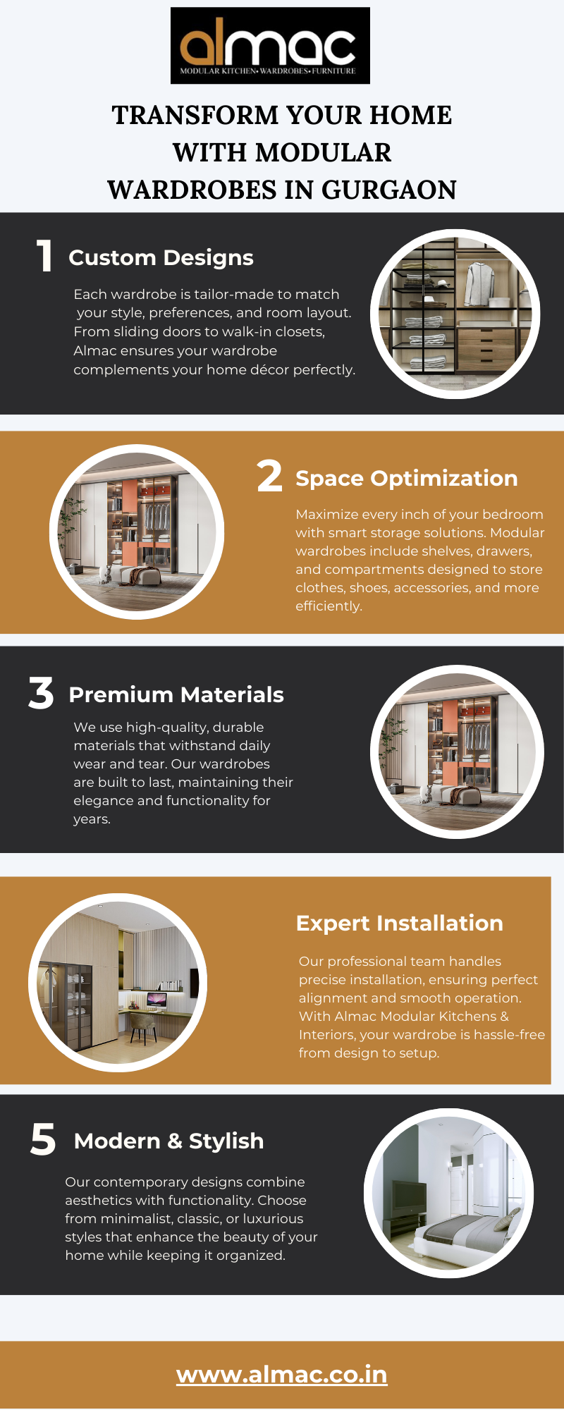 - Transform your bedroom with stylish modular wardrobes in Gurgaon by Almac Modular Kitchens & Interiors. Our custom-designed wardrobes maximize space, enhance functionality, and add a modern touch to your home. Choose from premium designs, durable materials, and expert installation. Upgrade your storage solutions today with trusted interior specialists!