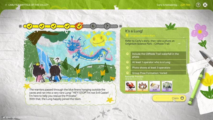 Completing all seven daily missions throughout the event yields the cumulative grand prize: the exclusive "Carly's Fairytale" portrait frame, along with Orobeyls, T-Credits, Cast Die, and valuable upgrade materials.