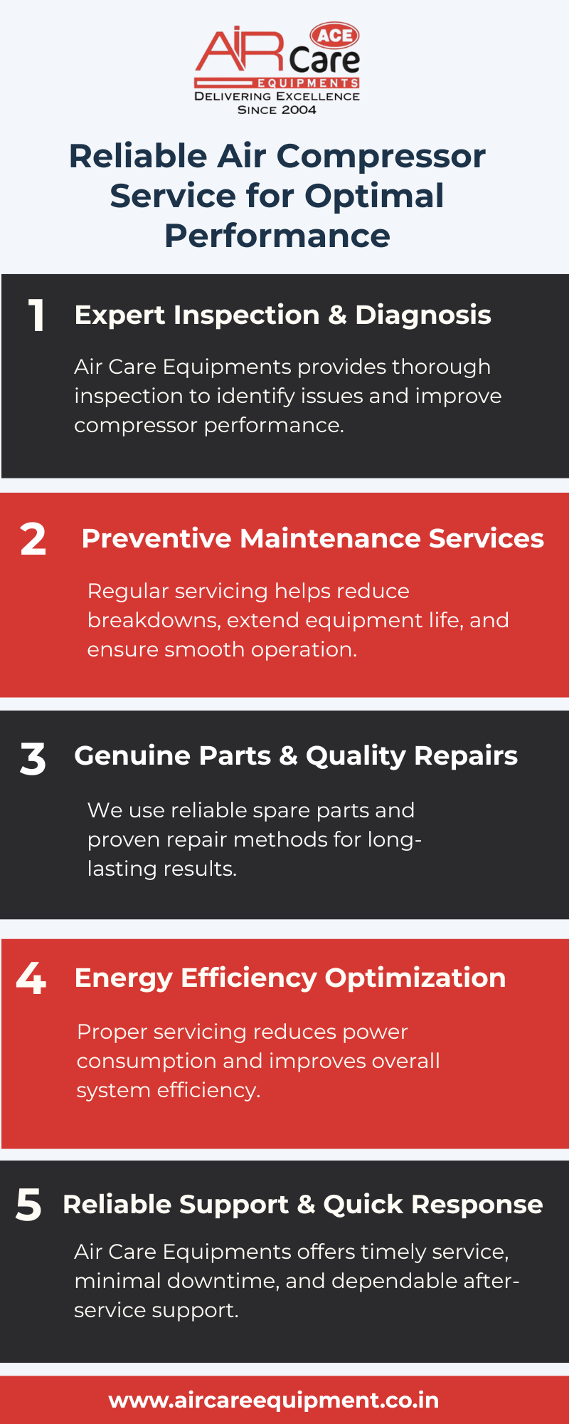 • Ensure peak performance with professional Air Compressor Service from Air Care Equipments. Our expert technicians provide maintenance, repairs, and efficiency checks for all types of air compressors. Extend equipment life, reduce downtime, and improve productivity with reliable service you can trust. Schedule your service today and keep your operations running smoothly.
